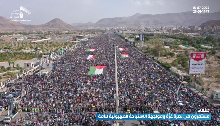 طوفان بشري بالعاصمة صنعاء في مليونية “مستمرون في نصرة غزة ومواجهة الاستباحة الصهيونية للأمة”