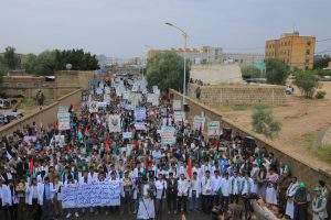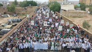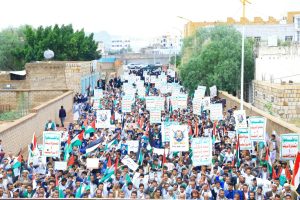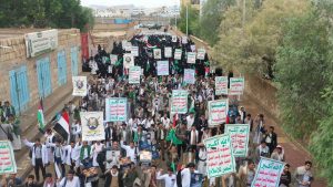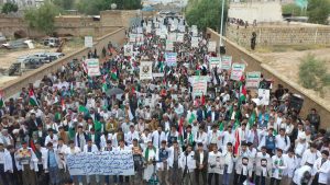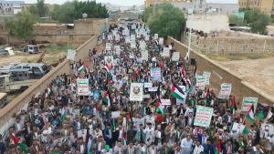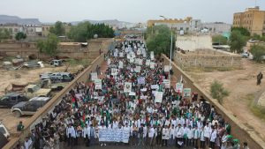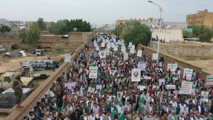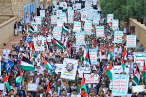 وانطلقت المسيرة من ساحة الجامعة وسطَ مشاركة واسعة لطلاب وطالبات وأكاديميي الجامعة، الذين رفعوا الشعارات واللافتات المؤكِّـدة على نصرة الشعب الفلسطيني وصموده في وجه العدوان الصهيوني الأمريكي، ومندّدين بالصمت العربي والتطبيع مع الاحتلال.