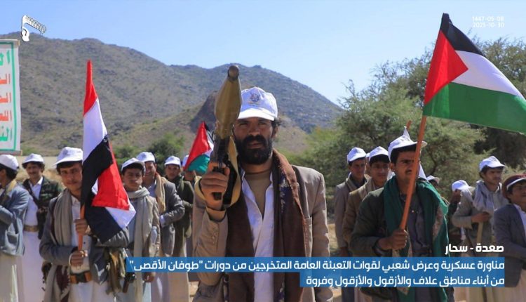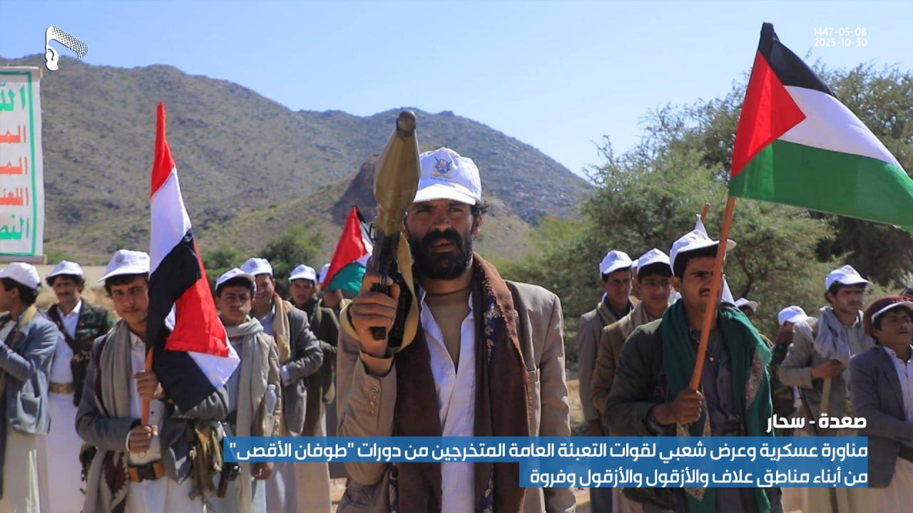 نظّم خريجو دورات “طوفان الأقصى”، من أبناء قبيلة كليب في مديرية سحار بمحافظة صعدة “دفعة الشهيد الغماري” ، عرضاً شعبياً ومناورة لخريجي الدورات العسكرية، تأكيداً على الجهوزية لمواجهة أي مؤامرات تستهدف الشعب اليمني، ونصرة للشعب الفلسطيني.