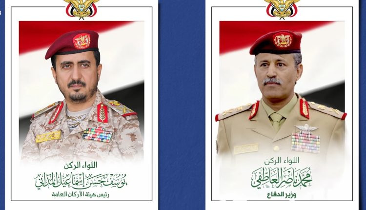 أكد وزير الدفاع والإنتاج الحربي اللواء الركن محمد ناصر العاطفي، ورئيس هيئة الأركان العامة اللواء الركن يوسف حسن المداني، أن القوات المسلحة اليمنية لن تصمت عن حق شعبنا المشروع في الدفاع وزلزلة الأرض من تحت أقدام المعتدين.