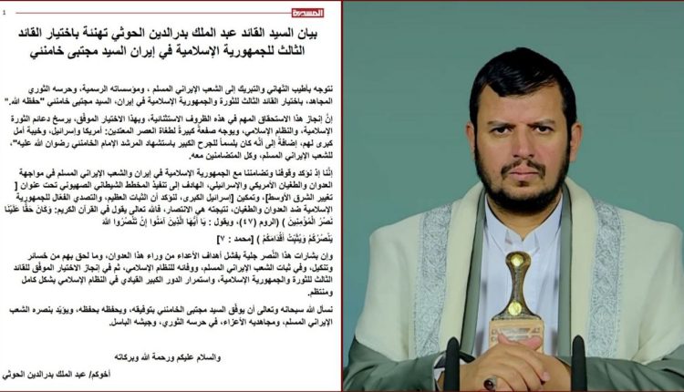 السيد القائد يهنئ إيران جيشاً وشعباً وقيادةً باختيار القائد الثالث ويؤكد ثبات الموقف اليمني الداعم للجمهورية الإسلامية
