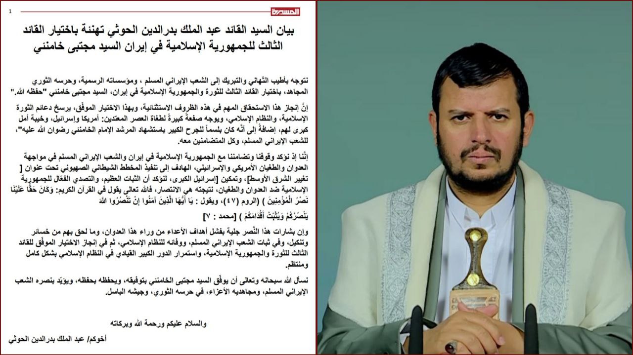 هنأ السيد القائد عبد الملك بدر الدين الحوثي، الشعب الإيراني ومؤسساته الرسمية وحرسه الثوري باختيار القائد الثالث للثورة والجمهورية الإسلامية في إيران السيد مجتبى خامنئي.