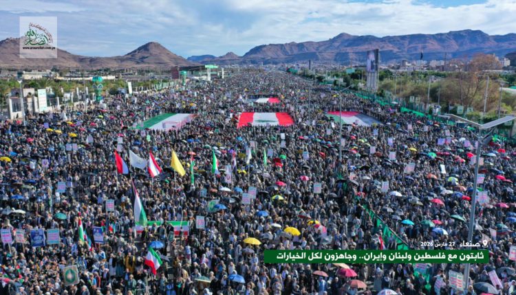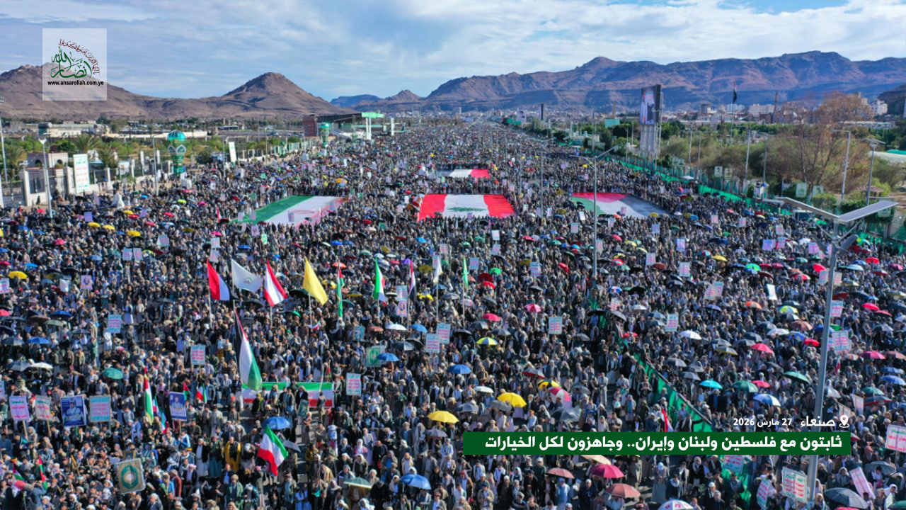 وجددت الحشود التي رفعت أعلام اليمن وفلسطين ولبنان وإيران، التأكيد على موقف اليمن الثابت والمبدئي في نصرة الشعب الفلسطيني وقضيته العالة، والتصدي للغطرسة الأمريكية والصهيونية التي تستهدف الأمة العربية والإسلامية.