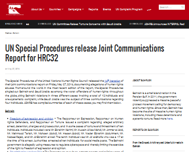 قال تقرير الاتصالات الصادر عن الإجراءات الخاصّة لمجلس حقوق الإنسان التابع للأمم المتحدة، إن كلا من البحرين والسعوديّة أسوأ المنتهكين لحقوق الإنسان في العالم. وأُصدر التقرير الإجراءات الخاصّة لمجلس حقوق الإنسان التي ذكرت بانتهاكات ارتكبتها البحرين في ثلاث قضايا مختلفة شملت 12 شخصا وشكوى واحدة لانتهاك ممنهج.