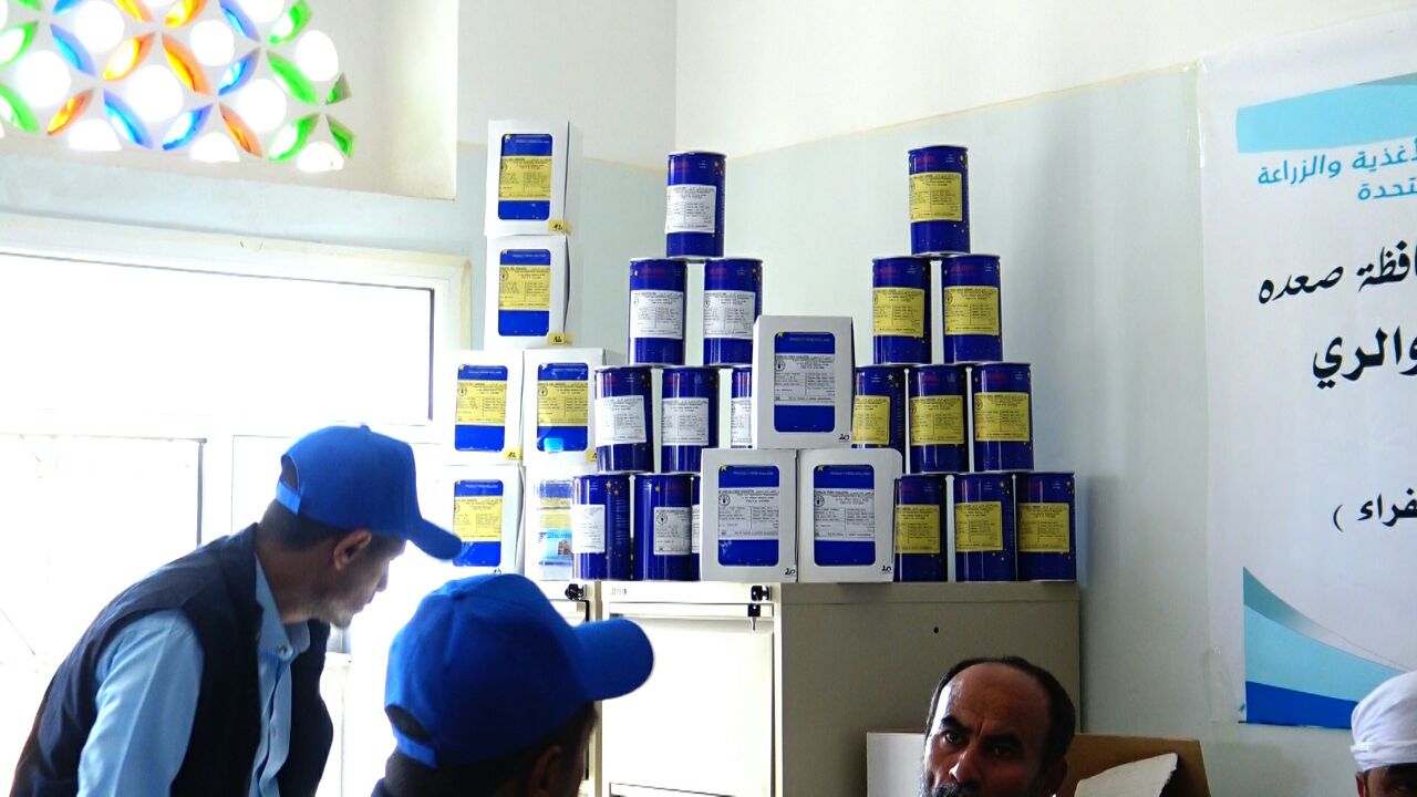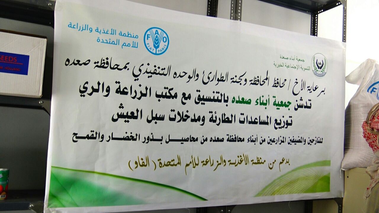 دشنت جمعية أبناء صعدة التنموية الإجتماعية الخيرية بالتنسيق مع مكتب الزارعة والري بمحافظة صعدة توزيع المساعدات الطارئة ومدخلات سبل العيش للنازحين والمضيفين المزارعين من أبناء محافظة صعدة من محاصيل بذور الخضار والقمح وذلك بدعم من منظمة الأغذية والزراعة للأمم المتحدة (الفاو) .
