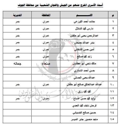 الجوف | 19 يونيو |صعدة نيوز أجريت اليوم الأحد عملية تبادل جديدة للأسرى بين الجيش اليمني واللجان الشعبية من جهة وبعض المجموعات المسلحة في محافظة الجوف من جهة ثانية.