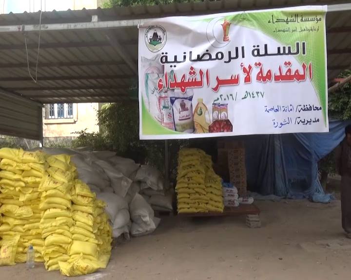 ووزعت مؤسسة الشهداء وجمعية المسيرة السلّات الغذائية لعدد من أسر الشهداء والجرحى والمفقودين في جبهات القتال في خطوة تعبّر عن رد بعض ما قدموه في سبيل الله والوطن، حيث تمت عملية التوزيع بحي الجراف بمديرية الثورة.
