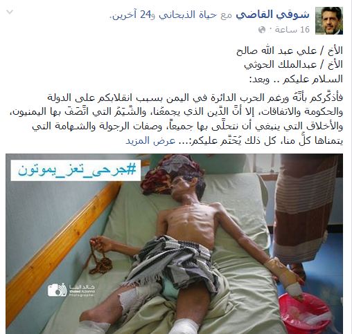 جاء ذلك بعد رسالة وجهها القيادي الإصلاحي شوقي القاضي إلى السيد عبدالملك الحوثي وعلي عبدالله صالح في منشور له على صفحته ” الفيسبوك ” مناشدهم فيها بمعالجة جرحاهم من المغرر بهم والمرتزقة الذي كانوا قد طُردوا من عدن بعلاجهم في صنعاء .