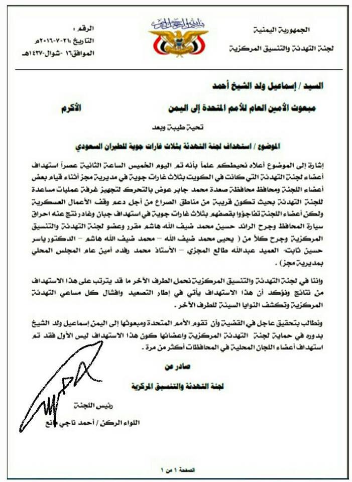 وقالت اللجنة في رسالتها للمبعوث الأممي إنه في يوم الخميس الساعة الثانية عصرا تم استهداف لجنة التهدئة بثلاث غارت جوية في مديرية مجز من قبل طيران العدوان أثناء قيامها بتجهيز غرفة عمليات مساعدة من أجل وقف الأعمال العسكرية.
