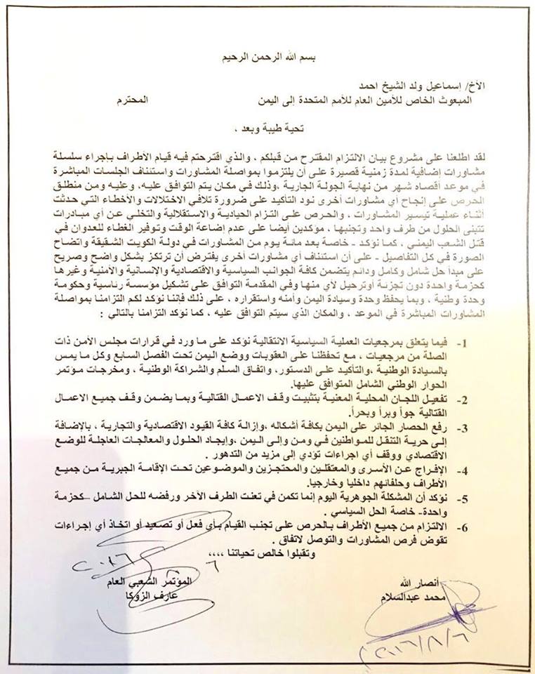 الأخ/ إسماعيل ولد الشيخ احمد المبعوث الخاص للأمين العام للأمم المتحدة إلى اليمن المحترم تحية طيبة وبعد ، لقد اطلعنا على مشروع بيان الالتزام المقترح من قبلكم ، والذي اقترحتم فيه قيام الأطراف بإجراء سلسلة مشاورات إضافية لمدة زمنية قصيرة على أن يلتزموا بمواصلة المشاورات واستئناف الجلسات المباشرة في موعد أقصاه شهر من نهاية الجولة الجارية ،وذلك في مكان يتم التوافق عليه، وعليه ومن منطلق الحرص على إنجاح أي مشاورات أخرى نود التأكيد على ضرورة تلافي الاختلالات والأخطاء التي حدثت أثناء عملية تيسير المشاورات ، والحرص على التزام الحيادية والاستقلالية والتخلي عن أي مبادرات تتبنى الحلول من طرف واحد وتجنبها ، مؤكدين أيضا على عدم إضاعة الوقت وتوفير الغطاء للعدوان في قتل الشعب اليمني ، كما نؤكد – خاصة بعد مائة يوم من المشاورات في دولة الكويت الشقيقة واتضاح الصورة في كل التفاصيل – على أن استئناف أي مشاورات أخرى يفترض أن ترتكز بشكل واضح وصريح على مبدأ حل شامل وكامل ودائم يتضمن كافة الجوانب السياسية والاقتصادية والإنسانية والأمنية وغيرها كحزمة واحدة دون تجزئة أوترحيل لأي منها وفي المقدمة التوافق على تشكيل مؤسسة رئاسية وحكومة وحدة وطنية ، وبما يحفظ وحدة وسيادة اليمن وأمنه واستقراره ، على ذلك فإننا نؤكد لكم التزامنا بمواصلة المشاورات المباشرة في الموعد ، والمكان الذي سيتم التوافق عليه ، كما نؤكد التزامنا بالتالي :