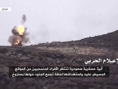 في المقابل وبينما كانت آلية عسكرية سعودية تنتظر الأفراد المنسحبين من الموقع المسيطر عليه دمرها المجاهدون بصاروخ مضاد للدروع لحظة تجمع الجنود حولها ما أثار حالة من الذعر والخوف اختزلت معها المعركة وعلى وقع الرصاص والانفجارات نتيجة احتراق مخازن أسلحتهم.