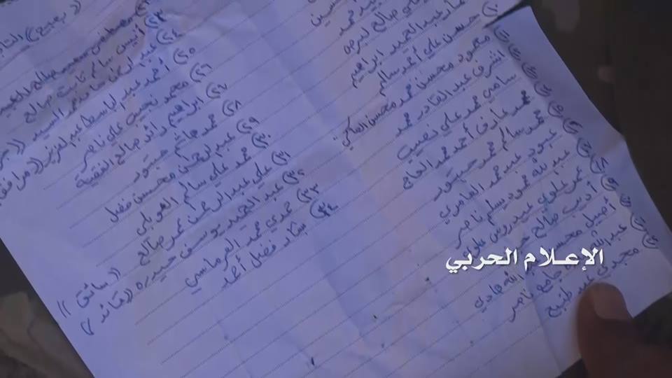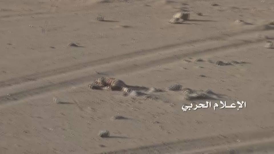 وتظهر المشاهد جثث قتلى المرتزقة مرمية في صحراء البقع وصورة لكشف اسماء المرتزقة الذين زج بهم النظام السعودي.