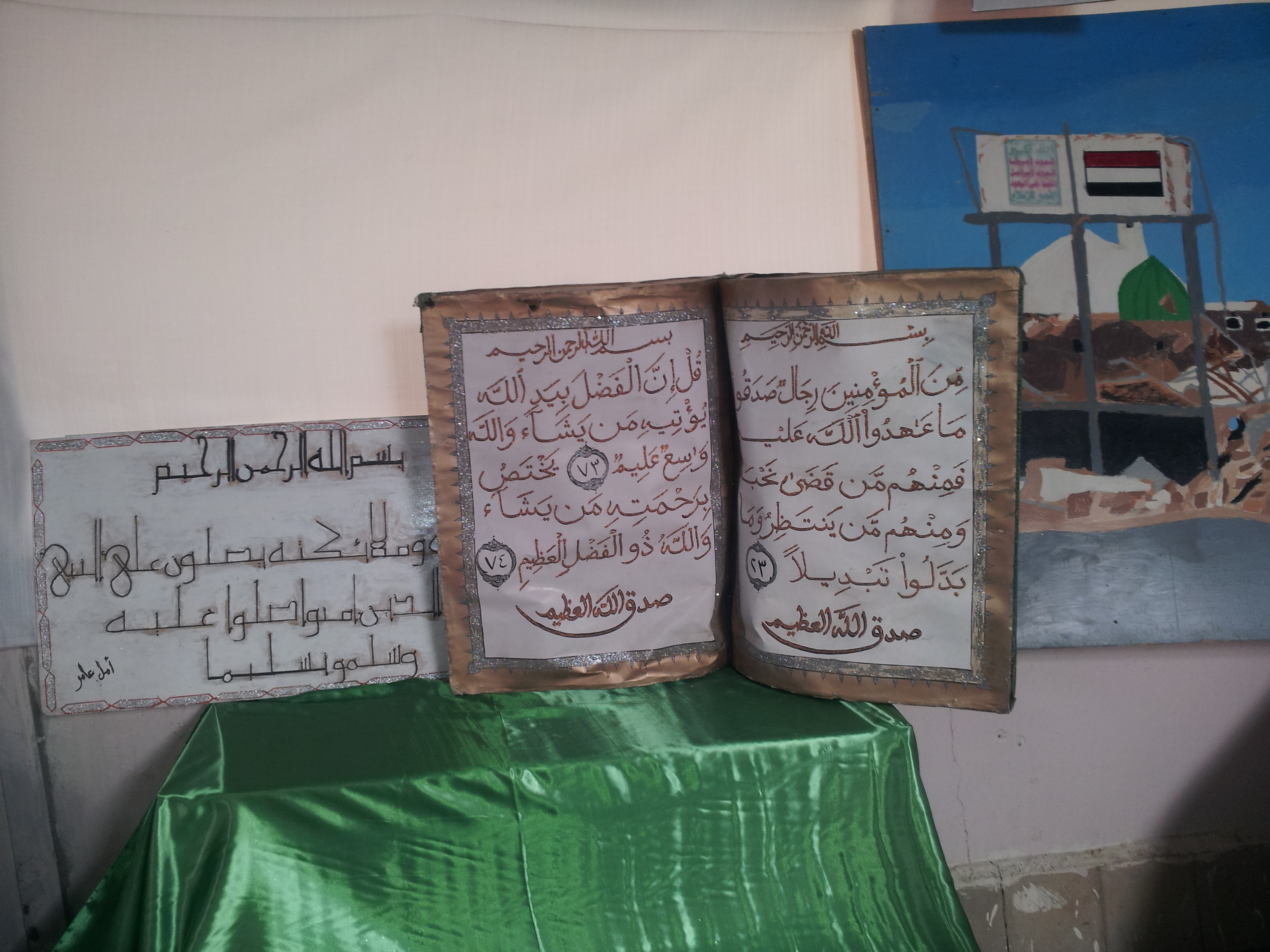 المعرض الذي اعدته معلمات وطالبات مدرسة الدرة بمناسبة قدوم المولد النبوي الشريف حوى العديد من التحف والمجسمات الفنية واللوائح والرسوم التي عبرت عن جوانب من حياة الرسول محمد صلوات الله عليه وعلى آله وجهادة ، وكذلك عبرت عن بشاعة العدوان السعودي الأمريكي على اليمن وعن الصمود الأسطوري لشعب الأيمان والحكمة ،وعكس مستوى الوعي والأبداع الذي يتحلى به معلمات وطالبات المدرسة .