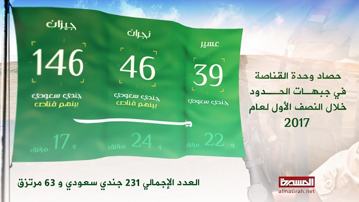 وفي إحصائية جديدة ، حصدت وحدة القناصة اليمنية خلال النصف الأول من العام الجاري 2017م، 231 جندياً سعودياً و63 مرتزقاً في جبهات جيزان ونجران وعسير.