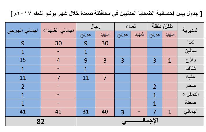 حيث بلغ 82 عدد الشهداء والجرحى في محافظة صعدة خلال شهر يونيو للعام 2017م