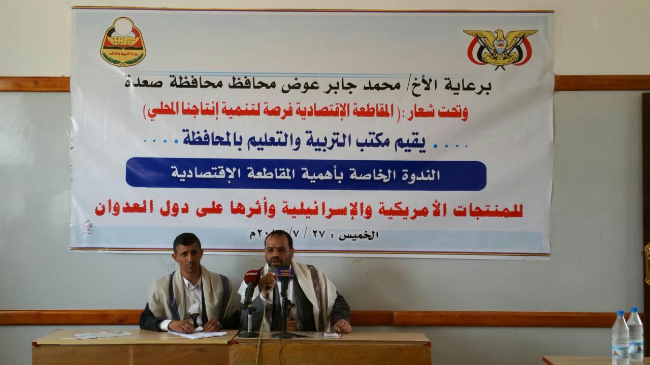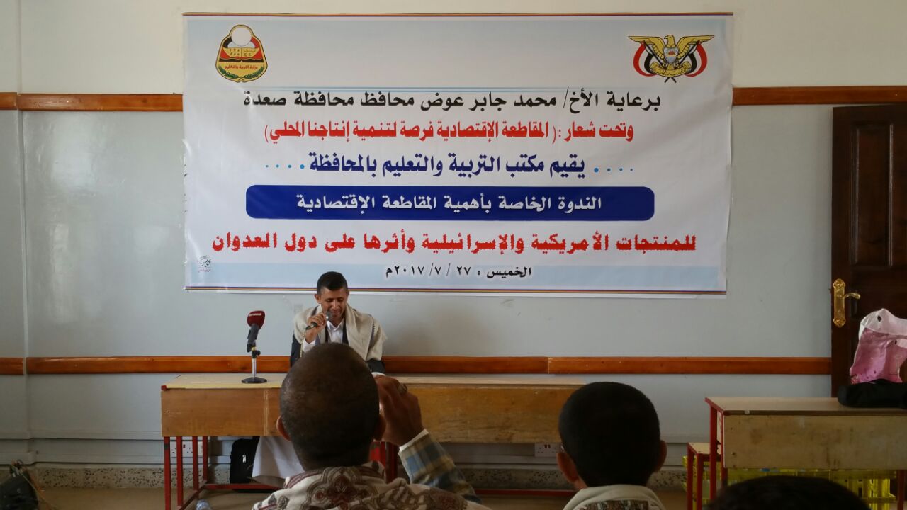نظم مكتب التربية والتعليم بمحافظة صعدة ، اليوم الخميس ، ندوة توعوية خاصة بأهمية المقاطعة الاقتصادية للمنتجات الأمريكية والإسرائيلية تحت شعار (المقاطعة الاقتصادية فرصة لتنمية انتاجنا المحلي) وبحضور محافظ المحافظة محمد جابر عوض وعدد من وكلاء المحافظة والشخصيات التربوية والاجتماعية والثقافية وجمع من المواطنين.