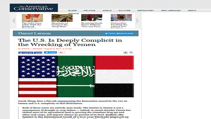 نشر موقع ” The American Conservative” مقالاً لكبير المحللين السياسيين دانيل ليرسون تحت عنوان “الولايات المتحدة الامريكية متورطة حتى النخاع في الحرب على اليمن”، أشار فيه إلى واحدة من التكتيكات التي يعتمدها السياسيين في إدارة ترامب وسابقاً إدارة أوباما هو الادعاء بأن الولايات المتحدة ليست طرفا في النزاع، وأنها ليس لها تأثير كبير على التحالف بقيادة السعودية، والظهور بمظهر أنها تفضل الحل الدبلوماسي لـ”الصراع”.