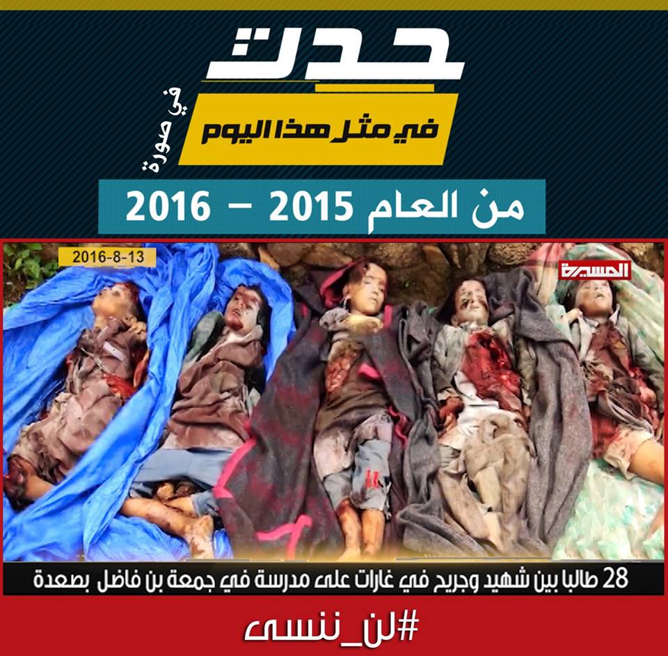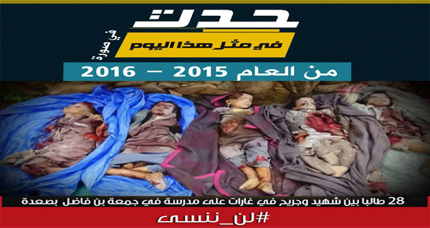 حدث في مثل هذا اليوم من العام الماضي “2016” طيران العدوان السعودي الأمريكي ارتكب مجزرة بشعة في محافظة صعدة حيث استهدف بغاراته إحدى المدارس لتحفيظ القرآن في منطقة جمعة بن فاضل بمديرية حيدان موقعا أكثر من 28 طالبا بين شهيد و جريح.