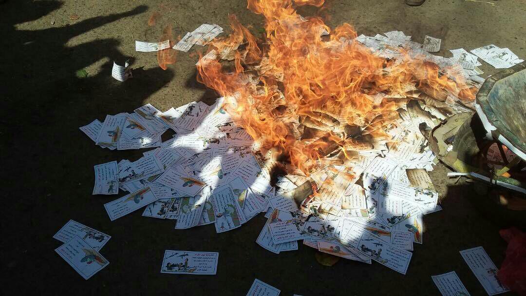 بالصور | إحراق منشورات ألقاها طيران العدوان على مديرية رازح بصعدة