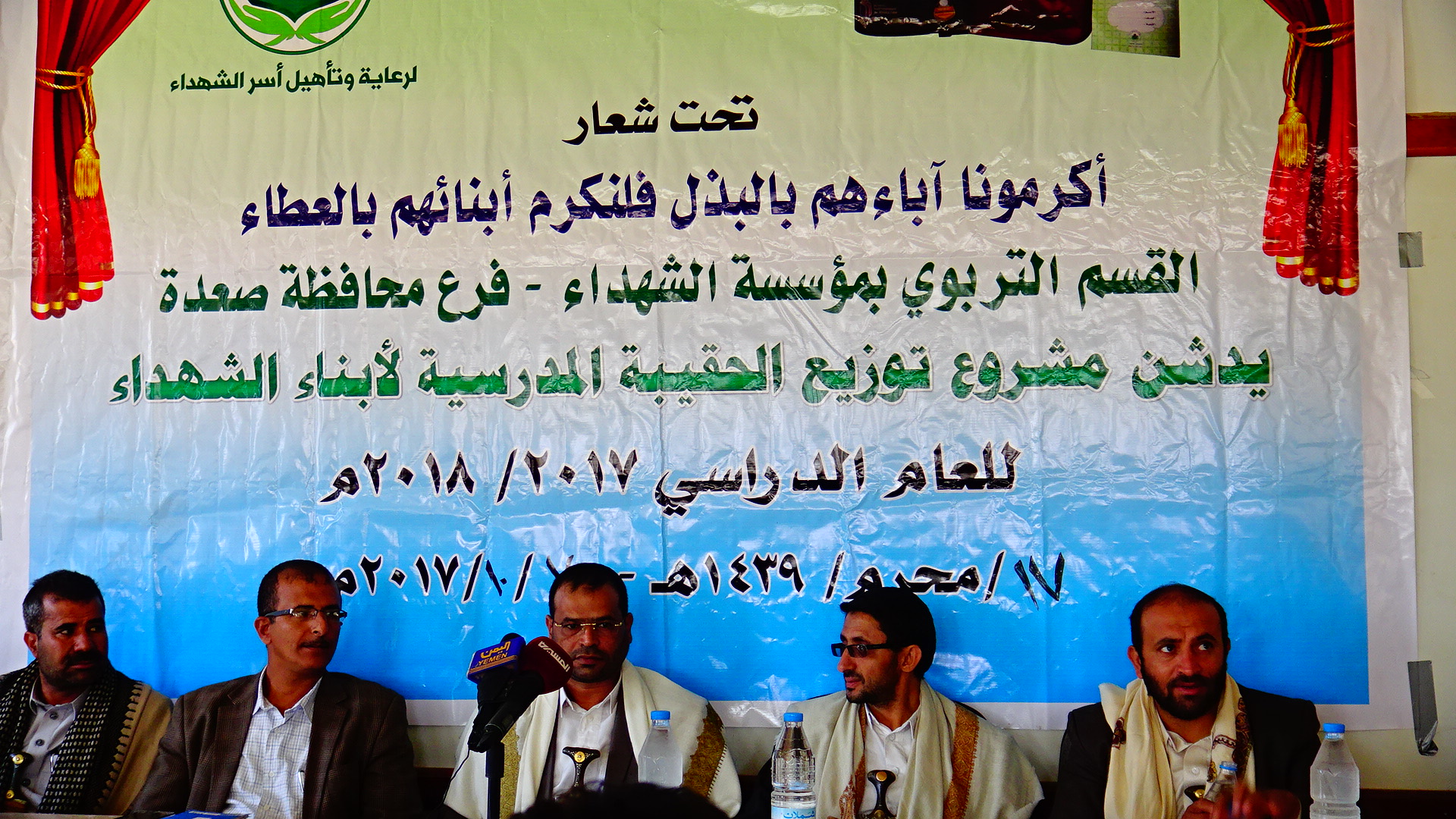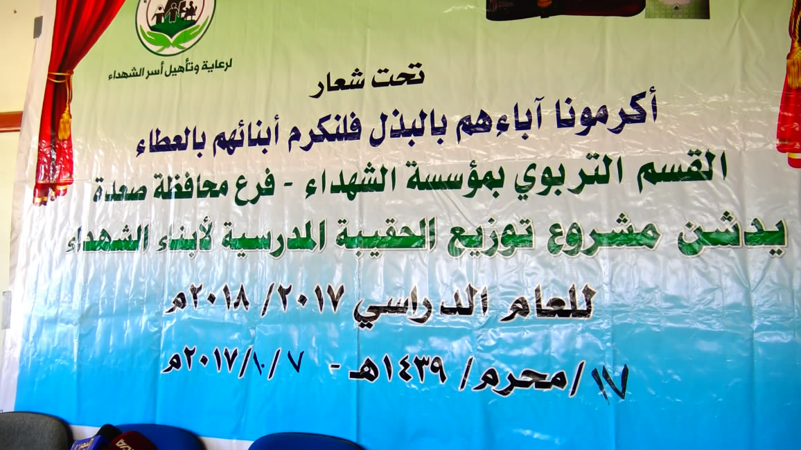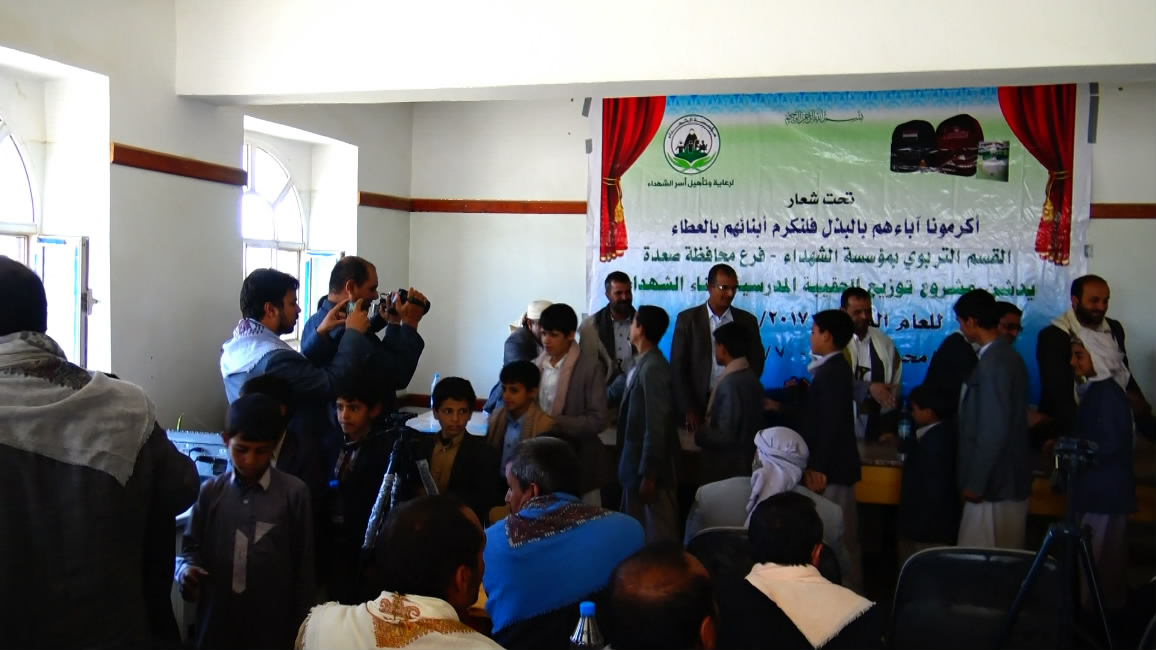 ويأتي هذا في اطار دور مؤسسة الشهداء في دعم والتخفيف من معاناة طلاب محافظة صعدة التي طالت منشأتهم التعليمية ايدي العدوان والذي حرم المعلمين من مرتباتهم بنقله للبنك المركزي اليمن بتواطؤ مع الامم المتحدة بغرض عرقة المرحلة التعليمية في اليمن