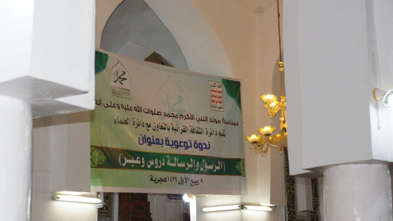 اقامت دائرة الثقافة القرآنية بالتعاون مع دائرة العلماء ، مساء اليوم ،بمدينة صعدة في مسجد الإمام الهادي عليه السلام ندوة توعوية تحت عنوان ” الرسول والرسالة دروس وعبر ” وذلك بمناسبة ذكرى المولد النبوي الشريف .