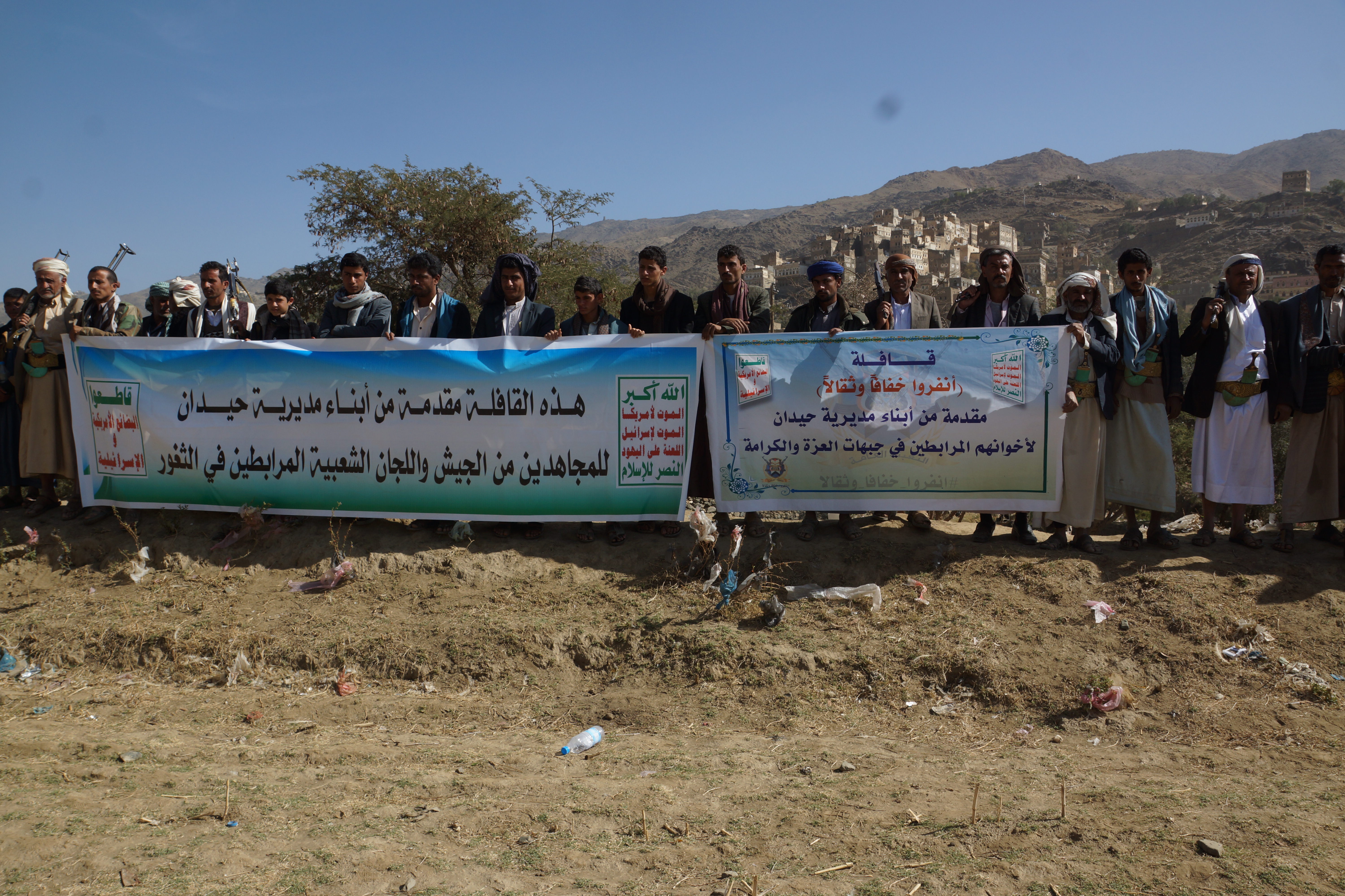 قدم اأبناء مديرية حيدان بمحافظة صعدة اليوم قافلة غذائية لرفد الجيش واللجان الشعبية تحت شعار ( انفروا خفافا وثقالا ) معززين ذلك العطاء بوقفة احتجاجية تنديدا بجرائم العدوان وقصف المساكن والمقابر واستمرار الحصار