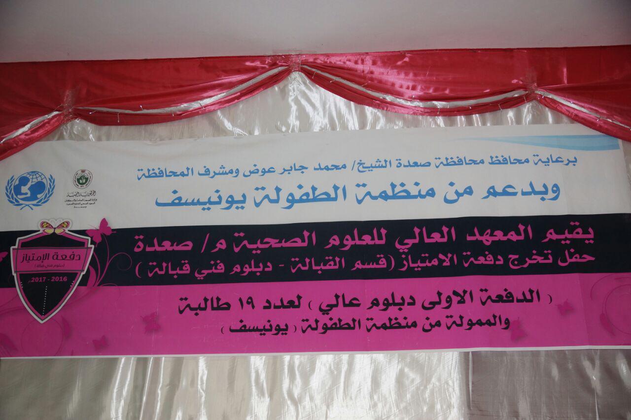 صعدة | 4 فبراير |موقع صعدة نيوز :أقيم اليوم حفل تخرج لدفعة الطالبات تحت أسم (دفعة الامتياز ) قسم القبالة دبلوم فني قبالة برعاية محافظ صعدة محمد جابرعوض ومكتب الصحة والمعهد العالي للعلوم الصحية ، وبدعم من منظمة اليونيسف .