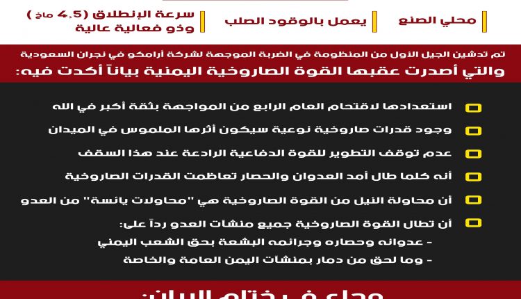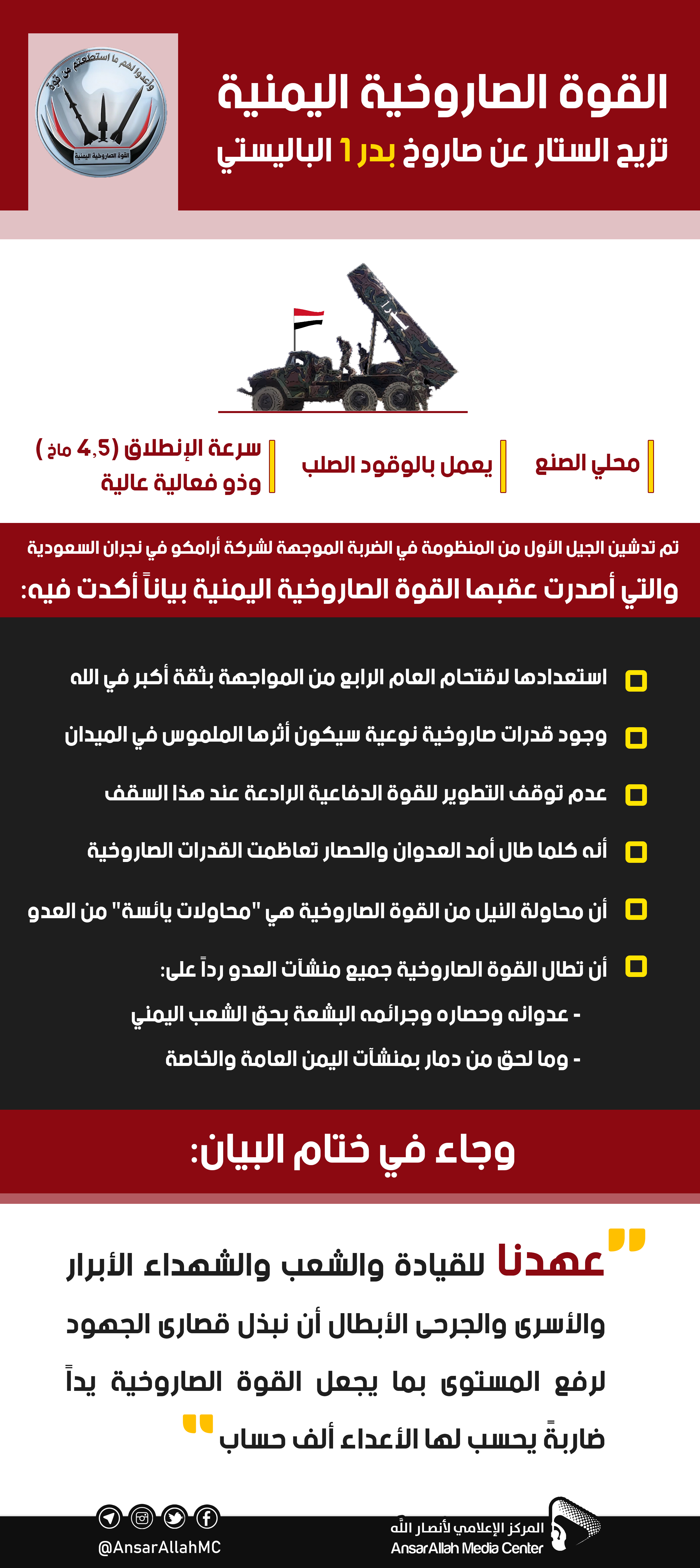 انفوجرافيك لمواصفات الصاروخ البالستي #بدر1 مع مقتطفات من بيان القوة الصاروخية اليمنية #إلى_السبعين_صباح_الإثنين