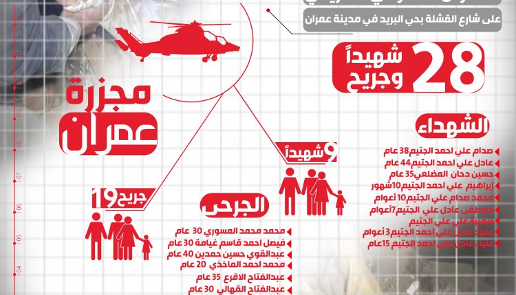 احصائية ضحايا المجزرة التي ارتكبهاطيران العدوان السعودي الامريكي بحق المدنيين في شارع القشلة بحي البريد بمحافظة عمران احصائية ضحايا المجزرة التي ارتكبهاطيران العدوان السعودي الامريكي بحق المدنيين في شارع القشلة بحي البريد بمحافظة عمران