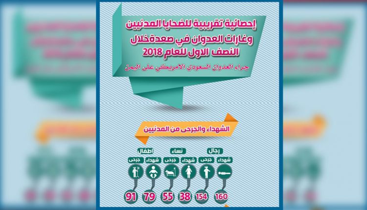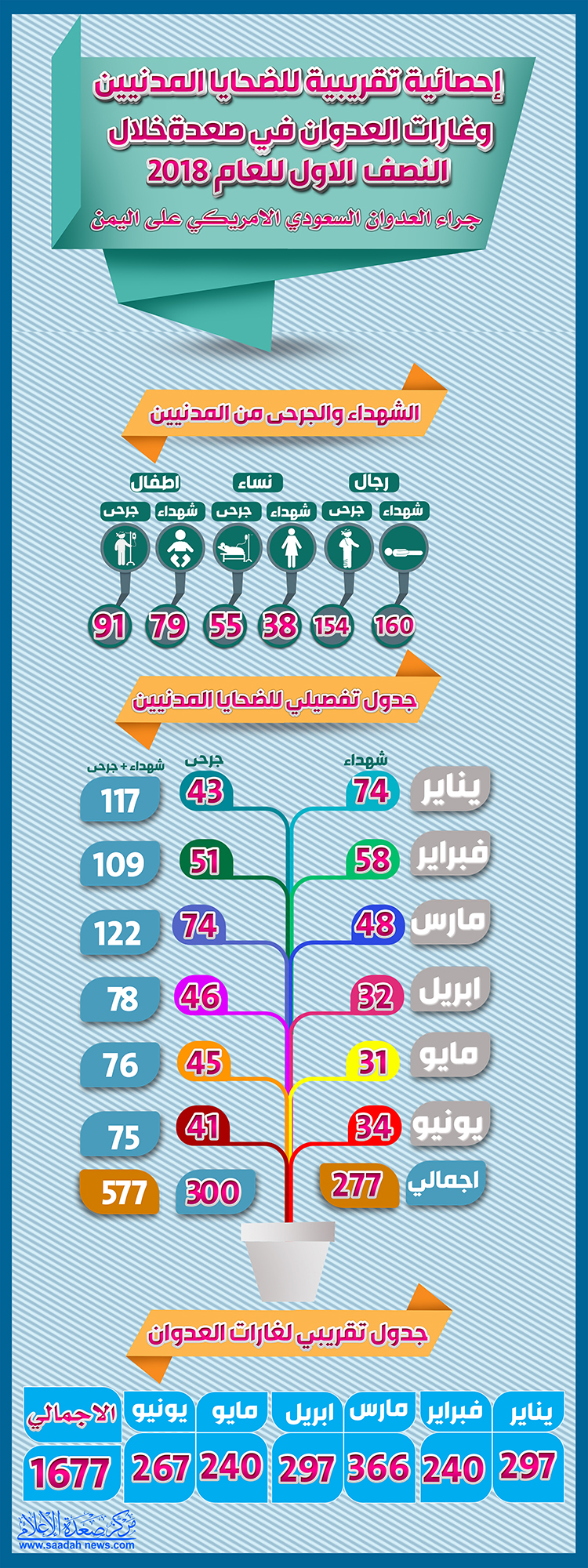 استشهد وجرح أكثر من 577 مواطن أغلبهم نساء وأطفال حصيلة ضحايا غارات العدوان الأمريكي السعودي الغاشم وقصفه الجوي الصاروخي والمدفعي على محافظة صعدة خلال النصف الأول للعام الجاري 2018م .