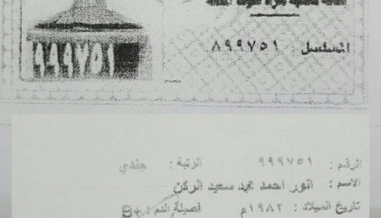 2. المرحوم كان عسكري في اللواء (115) بقيادة العميد / عبدالولي الجابري وتم تسليحه من قبل اللواء سلاح آلي خلال الاحداث وارساله إلى جبهة الشقب ، غير انه انسحب من الجبهة وقام ببيع السلاح الذي بعهدته (مرفق صورة بطاقته العسكرية ) .