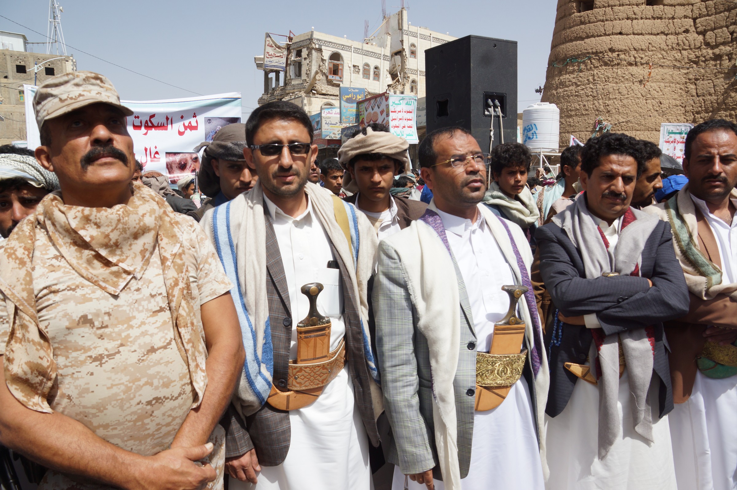 ورفع المتظاهرون لافتات ولافتات الحرية، ولافتات منددة بجرائم العدوان، وصورا لتلك الجرائم بحق الشعب اليمني.