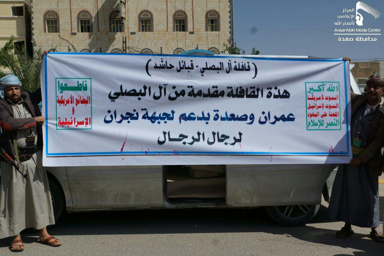 صعدة | 27 سبتمبر |صعدة : نيوز: سيًر أبناء آل البصلي اليوم في صعدة وعمران قافلة غذائية دعما للجيش واللجان الشعبية المرابطين في جبهات العزة والكرامة ، معززين هذا العطاء بوقفة احتجاجية تنديدا بجرائم العدوان بحق الشعب اليمني
