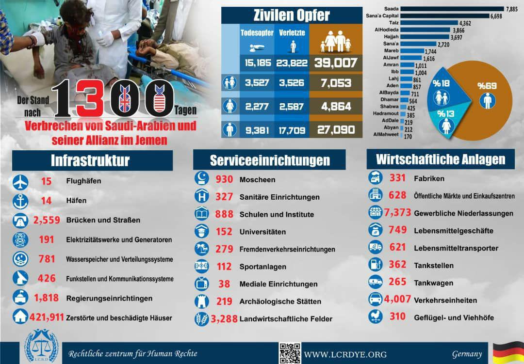 المركز القانوني يصدر إحصائية جديدة عن 1300 يوم من العدوان على اليمن