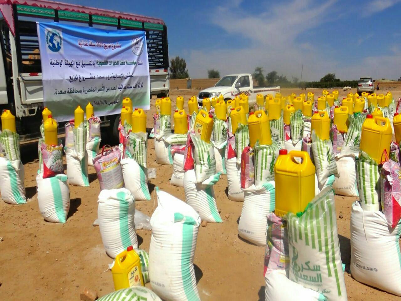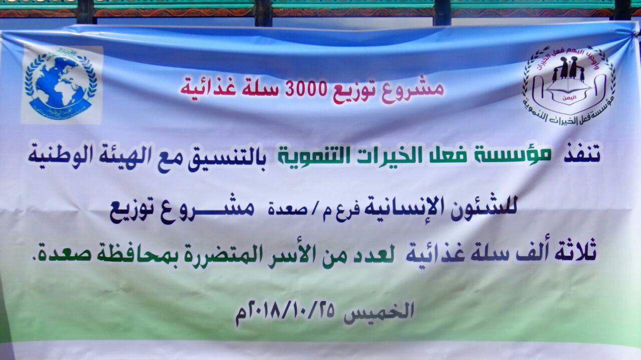 نفذت مؤسسة فعل الخيرات التنموية بالتنسيق مع فرع الهيئة الوطنية لإدارة وتنسيق الشؤون الإنسانية بصعدة ، اليوم الخميس، توزيع 3000 الف سلة غذائية للأسر المتضررة والأشد فقرا في محافظة صعدة.