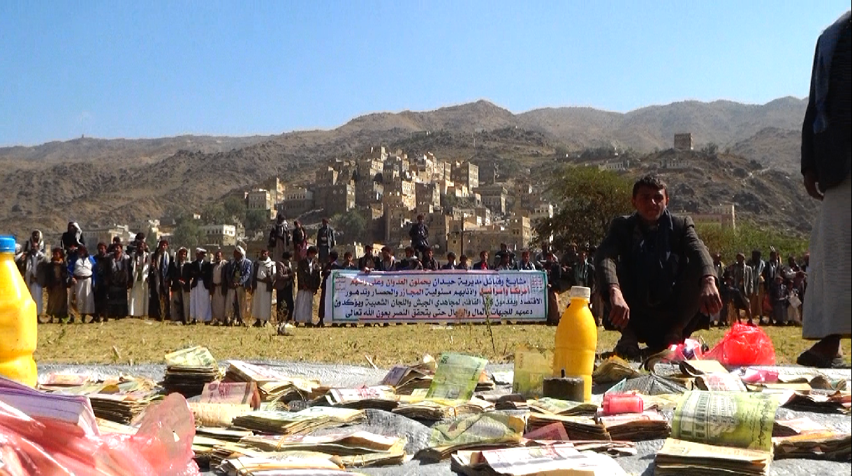 ونفذ الحاضرون من أبناء المديرية وقفة احتجاجية أدانوا فيها الجرائم التي يرتكبها طيران العدوان بحق المواطنين الآمنين في منازلهم بمختلف محافظات الجمهورية.