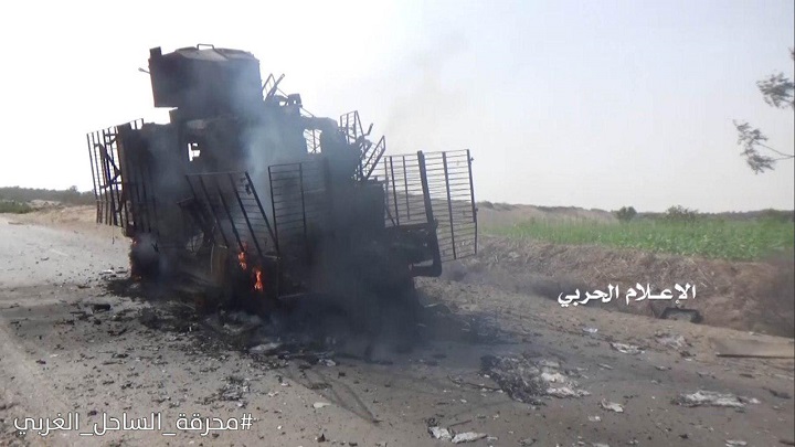 لقي عدد من قوى الغزو والمرتزقة مصارعهم، اليوم الجمعة، إثر تدمير مدرعة كانت تقلهم بالساحل الغربي.