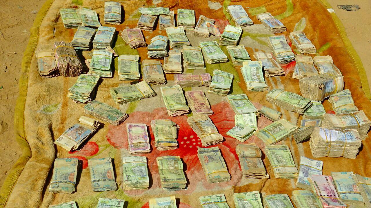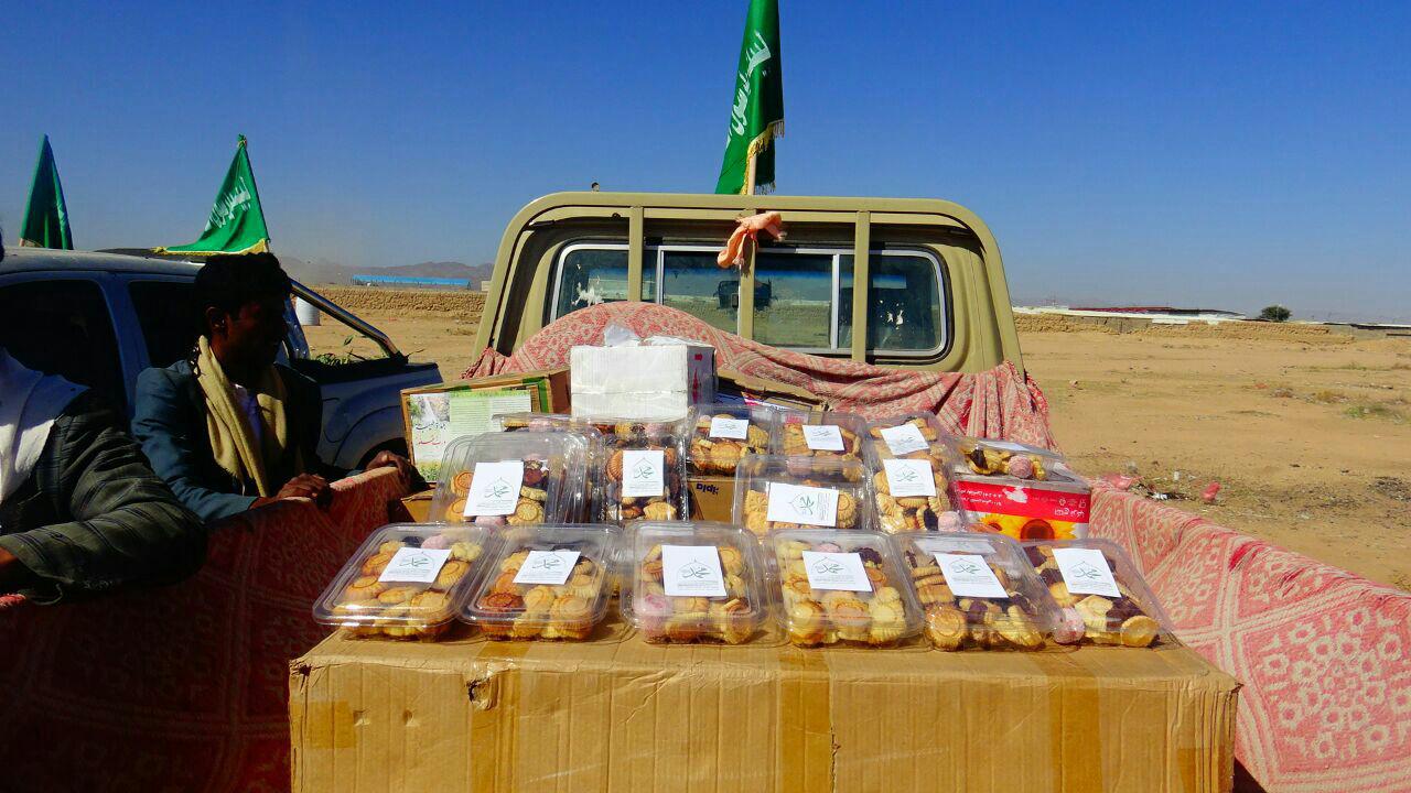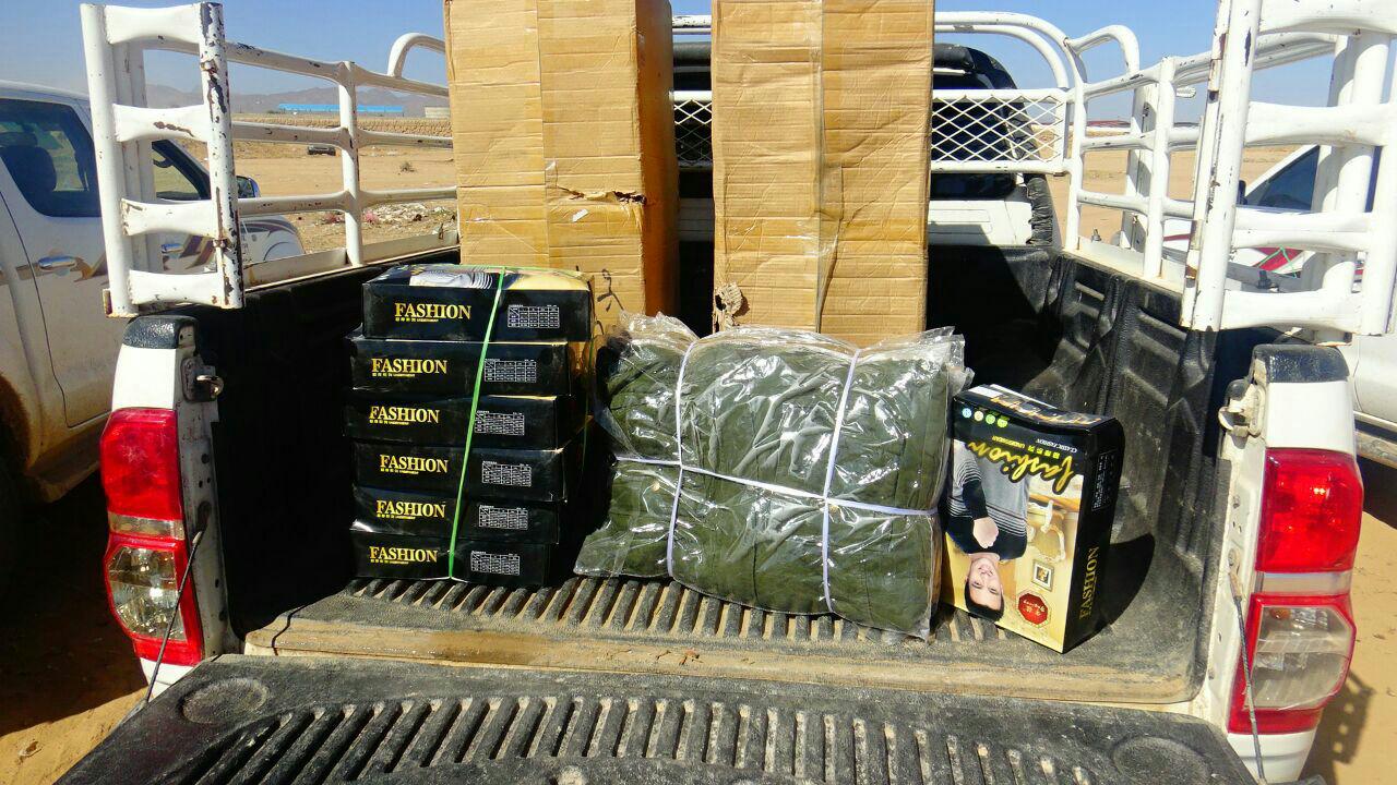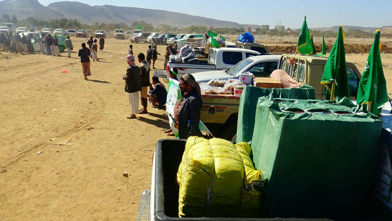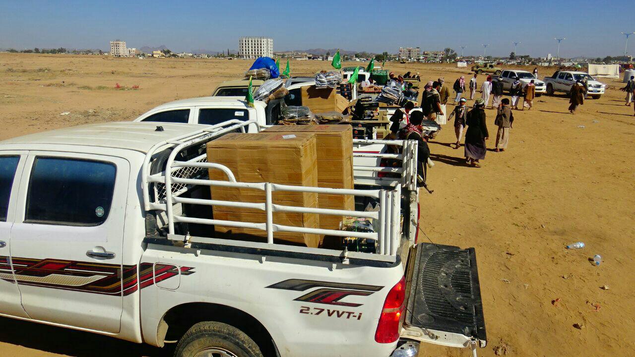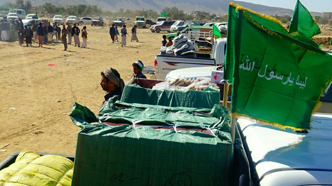 حيث شملت القافلة مبالغ مالية كبيرة وعدد من السيارات تحمل ملابس شتوية وزبيب أسود .