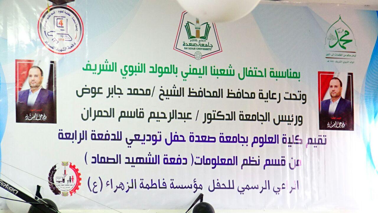 احتفلت جامعة صعدة تزامنا مع احتفالات شعبنا اليمني بالمولد النبوي بتخرج الدفعة الرابعة من قسم الحاسوب ـ نظم المعلومات لعدد من الطلاب والطالبات والتي حملت اسم (دفعة الشهيد الصماد) .