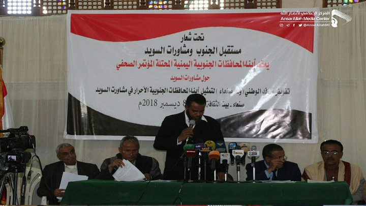 عقد بصنعاء اليوم السبت مؤتمر صحفي لأبناء المحافظات الجنوبية المحتلة، حول مشاورات السويد وتفويض الوفد الوطني “وفد صنعاء”، في هذه المشاورات.