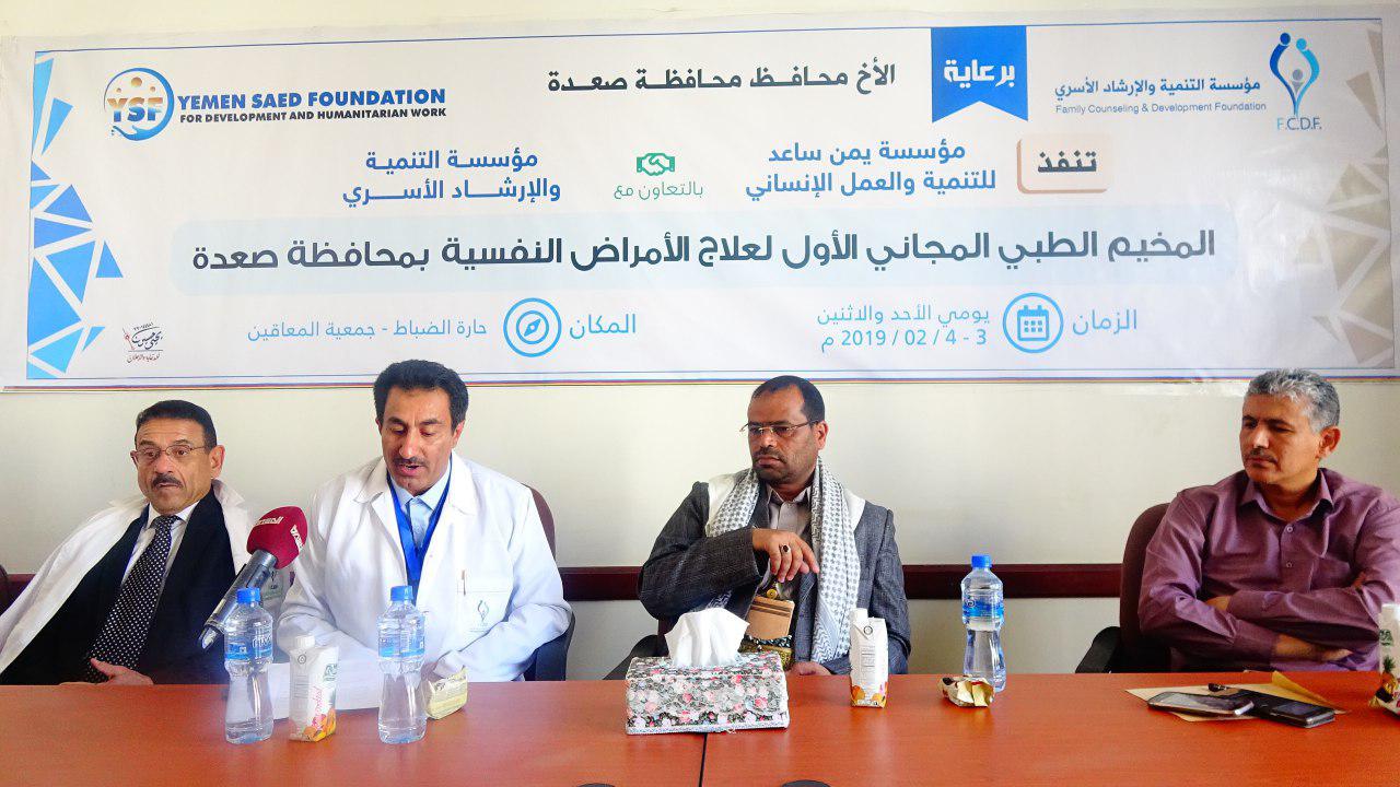 دشن اليوم بمحافظة صعدة المخيم الطبي المجاني الأول لعلاج الأمراض النفسية الذي تنفذه مؤسسة يمن ساعد للتنمية والعمل الإنساني بالتعاون مع مؤسسة التنمية والإرشاد الأسري .