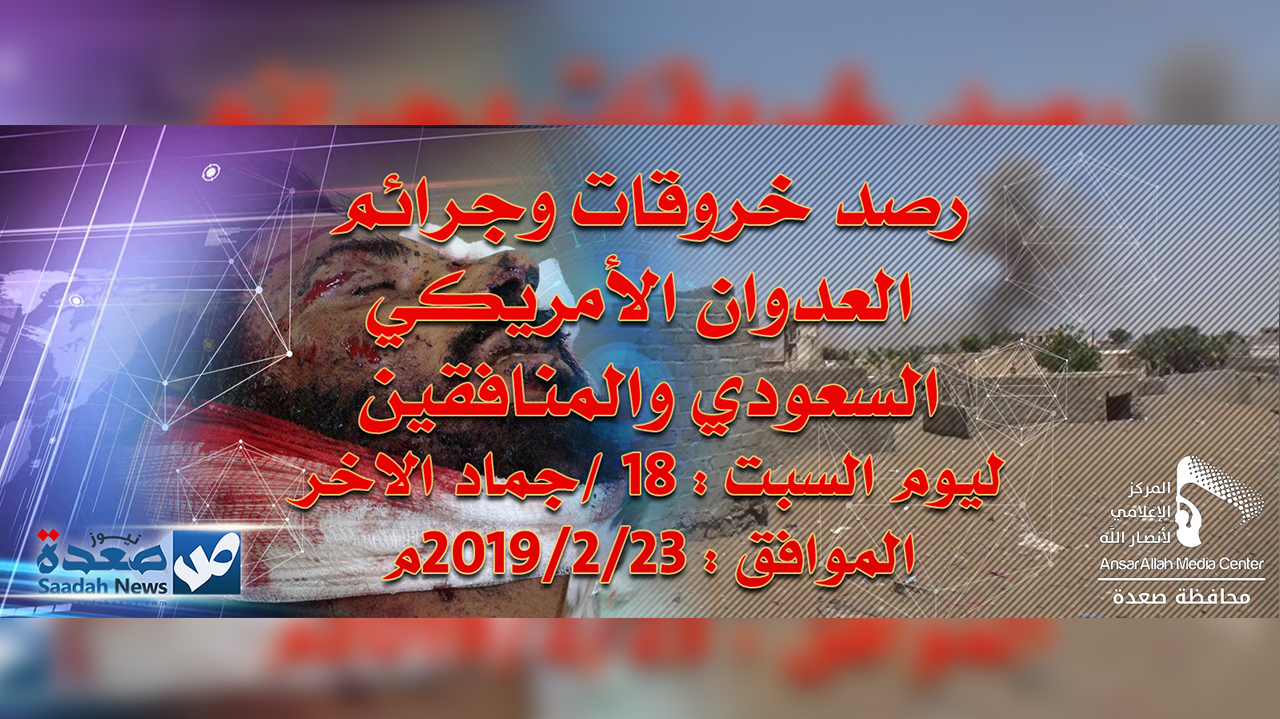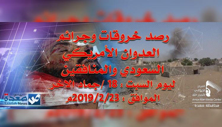 رصد خروقات وجرائم العدوان الأمريكي السعودي والمنافقين ليوم السبت (18- جماد الآخر – 1440)هـ الموافق (23-02-2019)م
