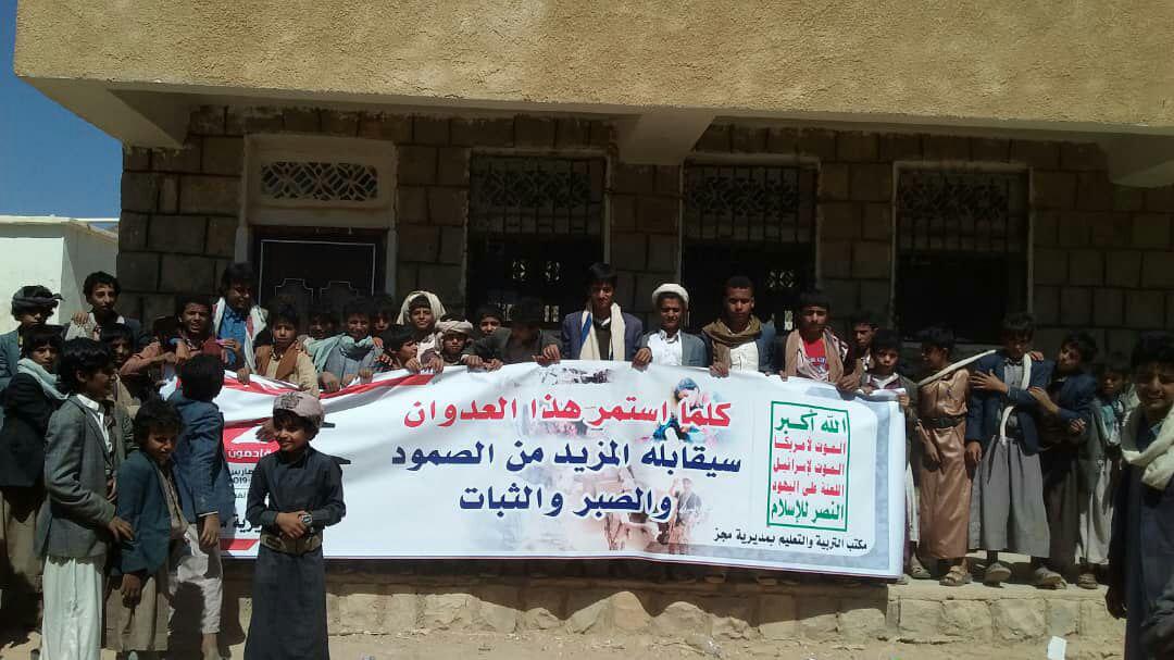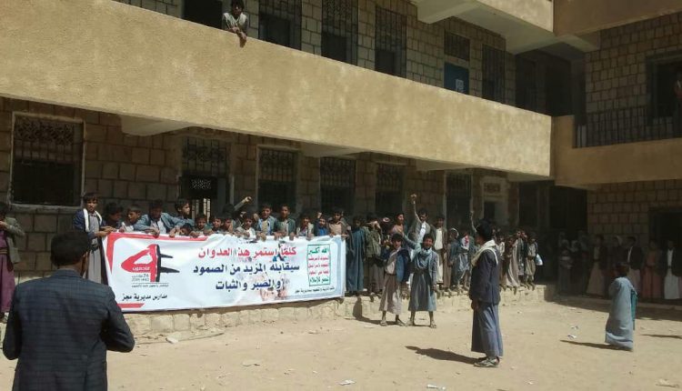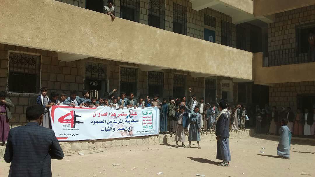 وفي منطقة ضحيان نظمت معلمات وطالبات مدرسة الزهراء وقفة إحتجاجية تخللتها عدد من الكلمات المنددة والشاجبة باستمرار العدوان، واستهداف العملية التعليمية بالقصف والتدمير.