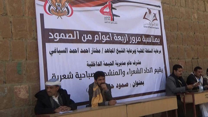 بمناسبة مرور أربعة أعوام من الصمود في وجه العدوان الصهيوني الأمريكي وبرعاية السلطة المحلية ومسؤول أنصار الله بمديرية الحيمة الداخلية، أقام اتحاد الشعراء والمنشدين صباحية شعرية وثقافية.