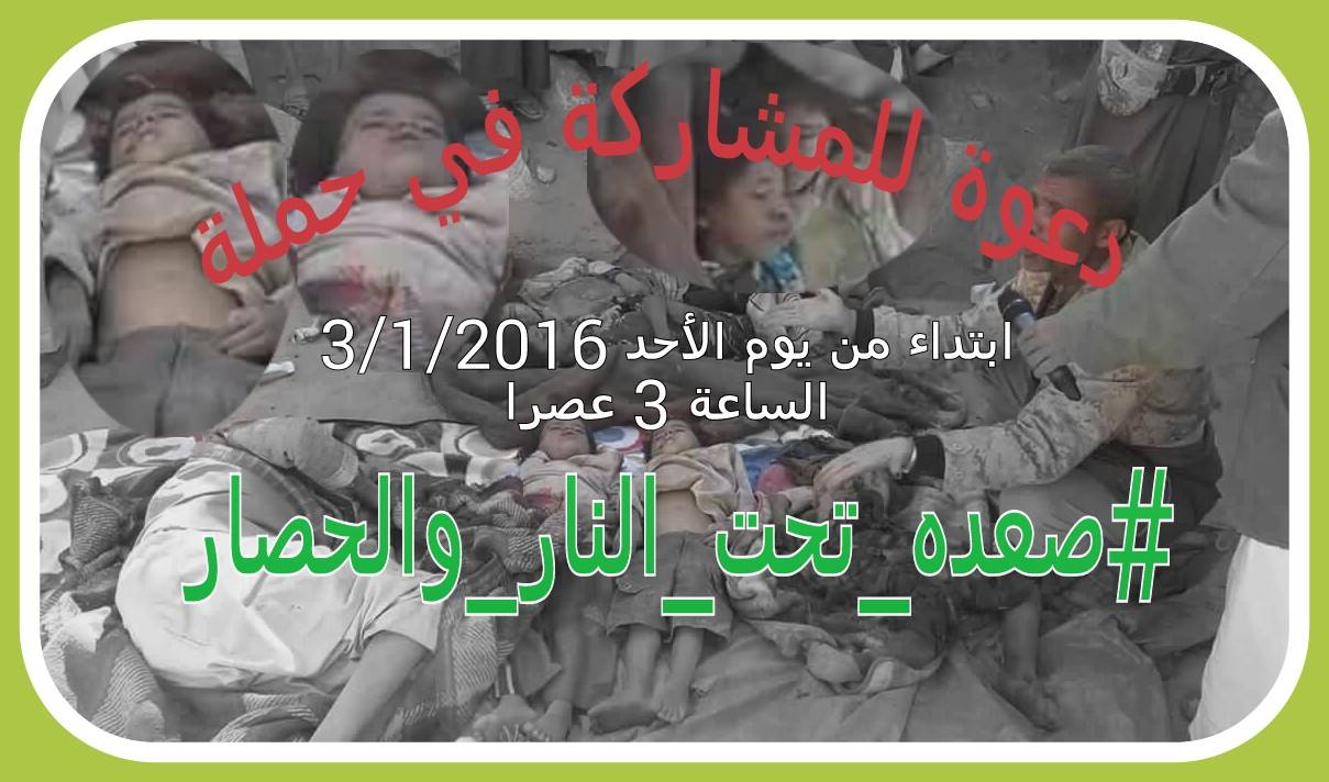 ندعو كل الشرفاء والأحرار في اليمن والعالم للمشاركة في الحملة الإعلامية التضامنية مع محافظة صعدة وابنائها الذين يتعرضون لحرب إبادة مضاعفة يشنها تحالف العدوان السعودي الأمريكي الذي لم يتوانى في إعلانها منطقة عسكرية مفتوحة واعتبر كل ساكن فيها ومتحرك أهدافا مشروعة لطائراته وصواريخه وقنابله المحرمة دوليا.