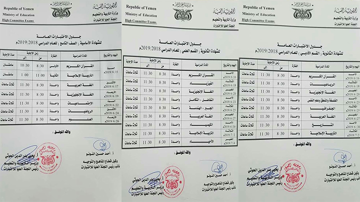 أعلنت وزارة التربية والتعليم جدول سير الاختبارات النهائية العامة للشهادة الأساسية والثانوية بقسميها العلمي والأدبي للعام الدراسي ٢٠١٨/ ٢٠١٩م .
