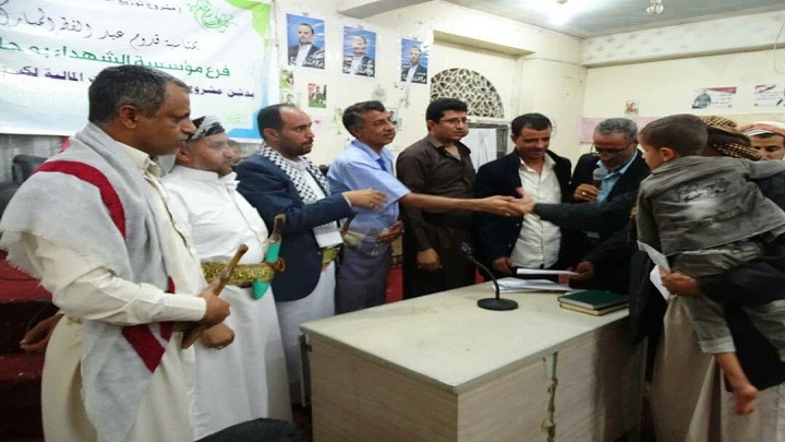 وفي محافظة المحويت دشنت مؤسسة رعاية وتأهيل أسر الشهداء مشروع صرف المساعدات المالية لكسوة العيد لأبناء الشهداء بمديرية الطويلة.