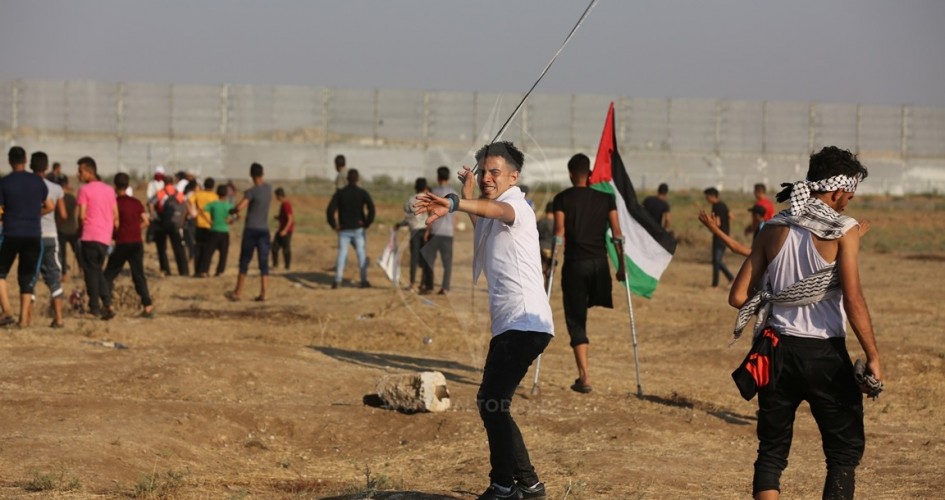 ويتظاهر الفلسطينيون كل يوم جمعة، ضمن فعاليات مسيرة العودة قبالة السياج الفاصل وأمامهم جنود العدو الإسرائيلي، ويحتجون بشكل سلمي ضد الحصار وتأكيدا على حق العودة.