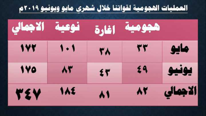 وقال سريع في مؤتمره الصحفي اليوم الثلاثاء، إن” قواتنا نفذت خلال مايو ويونيو أكثر من 347 عملية عسكرية هجومية منها 82 عملية هجوم واقتحام و81 عملية إغارة و184 عملية نوعية تم خلالها تحرير عشرات المواقع والقرى وتكبيد العدو ومرتزقته خسائر فادحة”.