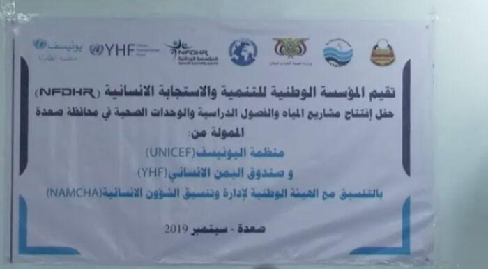 دشنت المؤسسة الوطنية للتنمية والاستجابة الانسانية العمل بواحد وثلاثين مشروعا في مجال المياة والصحة والتعليم في مختلف مديريات محافظة صعدة بلغت اجمالي تكلفة المشاريع اثنين مليون ومائه وخمسين الف دولار منها مليون واربعمائه الف دولار في مجال المياة والصحة بتمويل منظمة اليونيسف وسبعمائه وخمسين الف دولار في مجال التعليم بدعم صندوق اليمن الانساني. بالتنسيق مع الهيئه الوطنيه لادارة وتنسيق الشؤون الانسانية